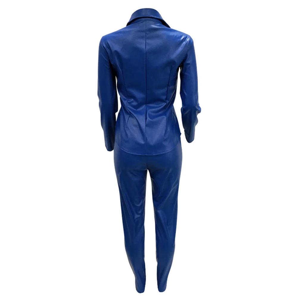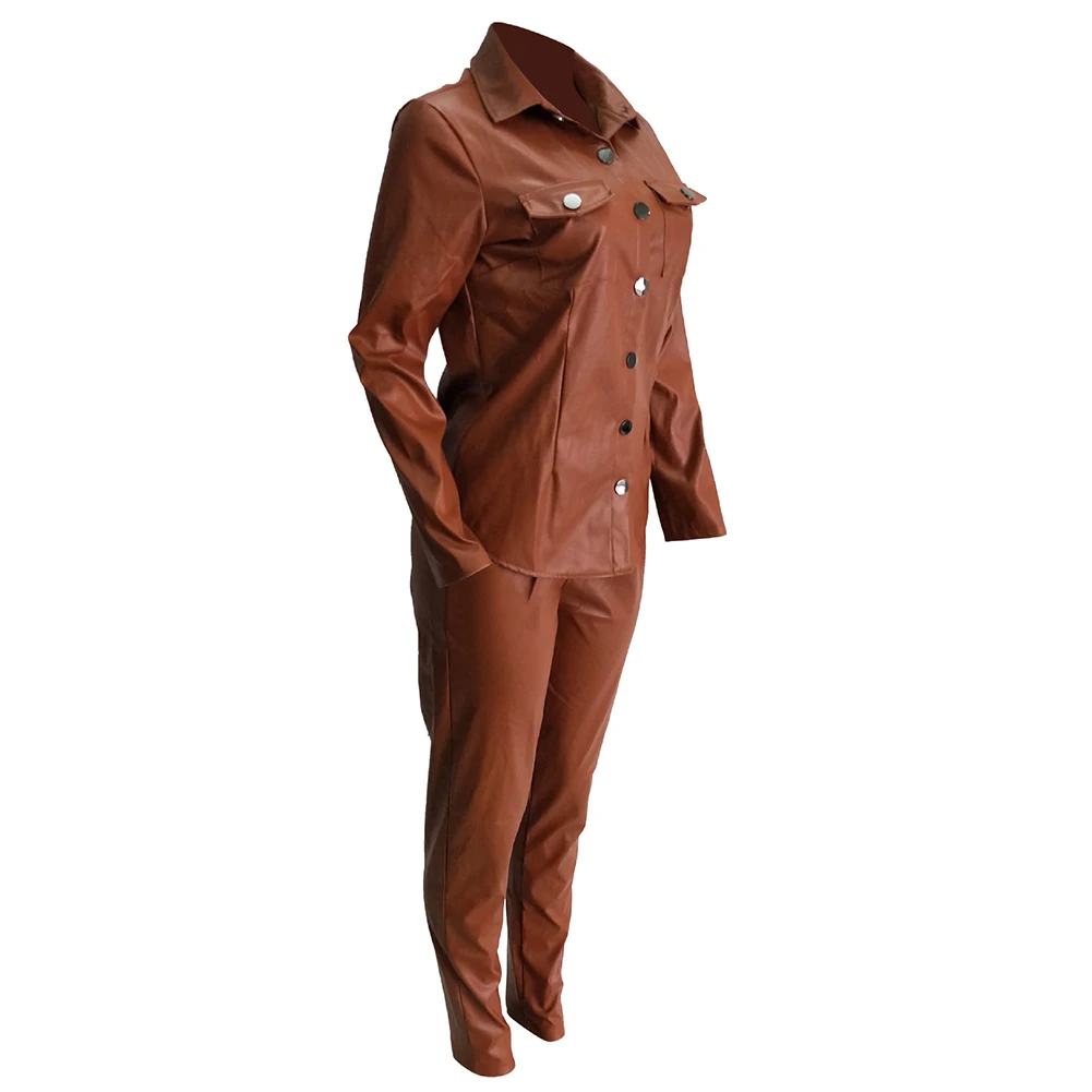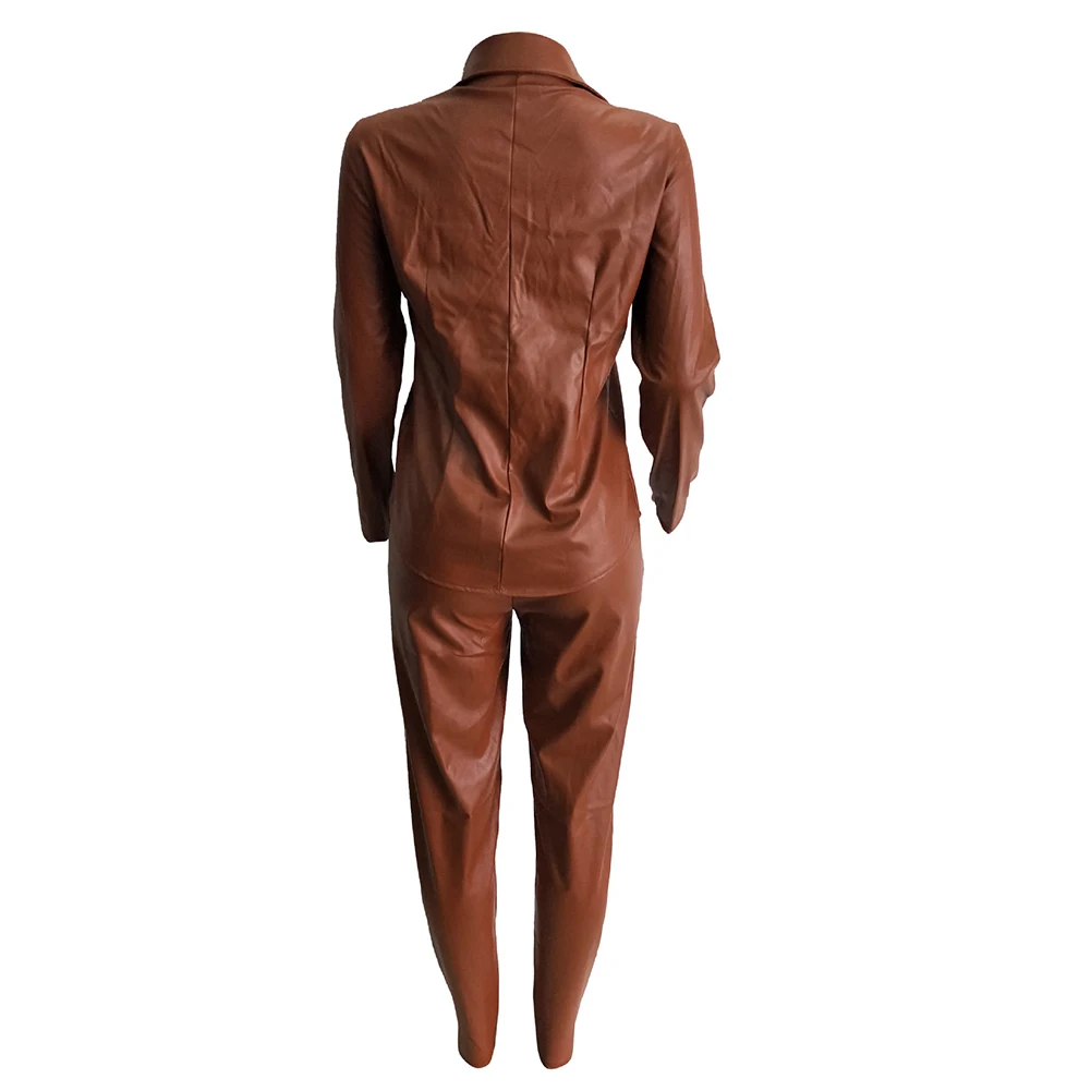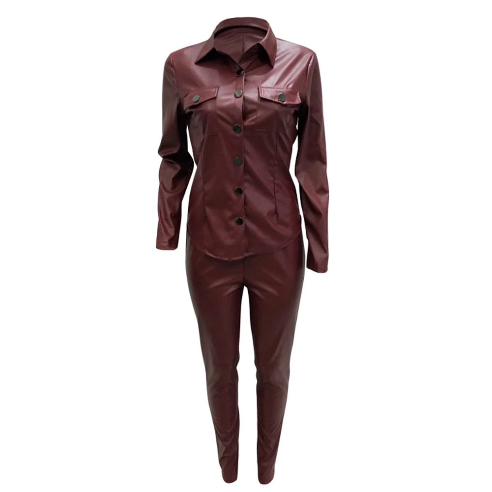 Women Casual Solid Color Faux Leather Turn Down Collar Shirt Pants Two-piece Set