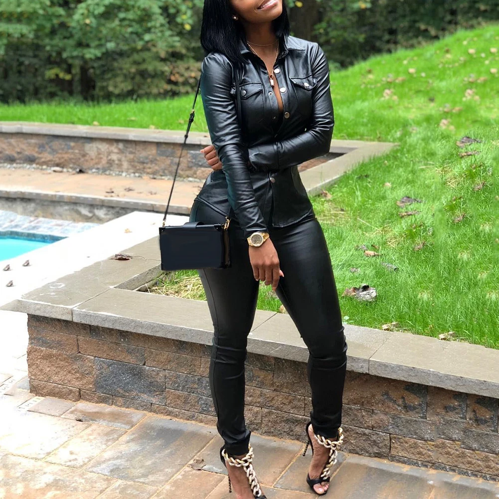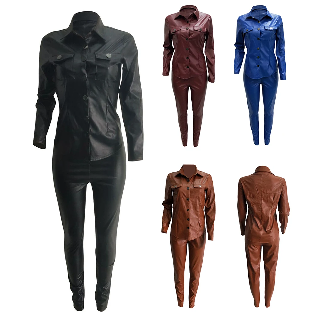 5 color S-XXXL Winter Overalls PU Leather shirt+Pencil pant tracksuit fashion sexy women set two pieces Jumpsuit casual Outfits