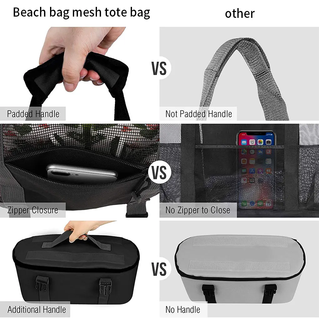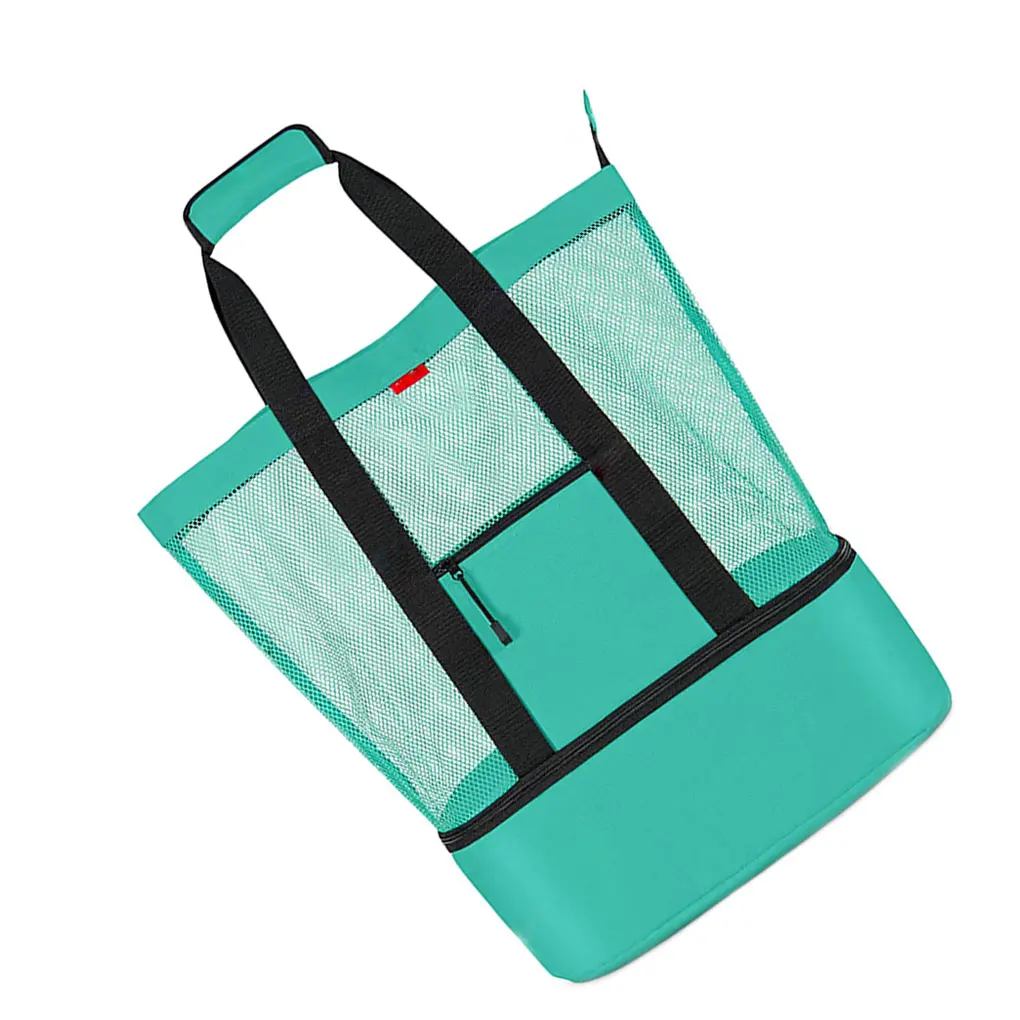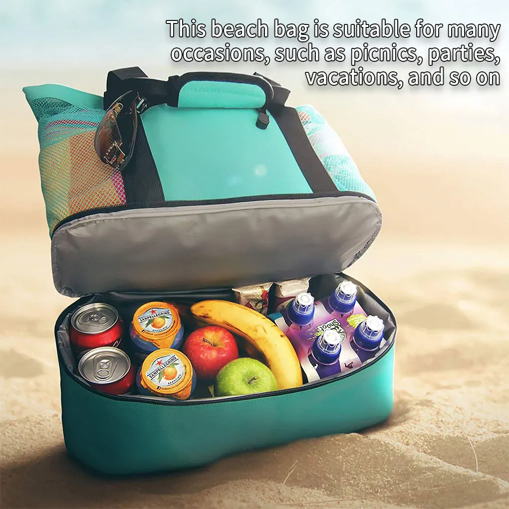 This beach cooler bag has a large capacity. The mesh bag can store your sundries, and the cooler bag can store up to 12 cans of drinks.