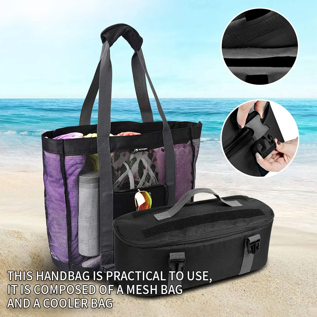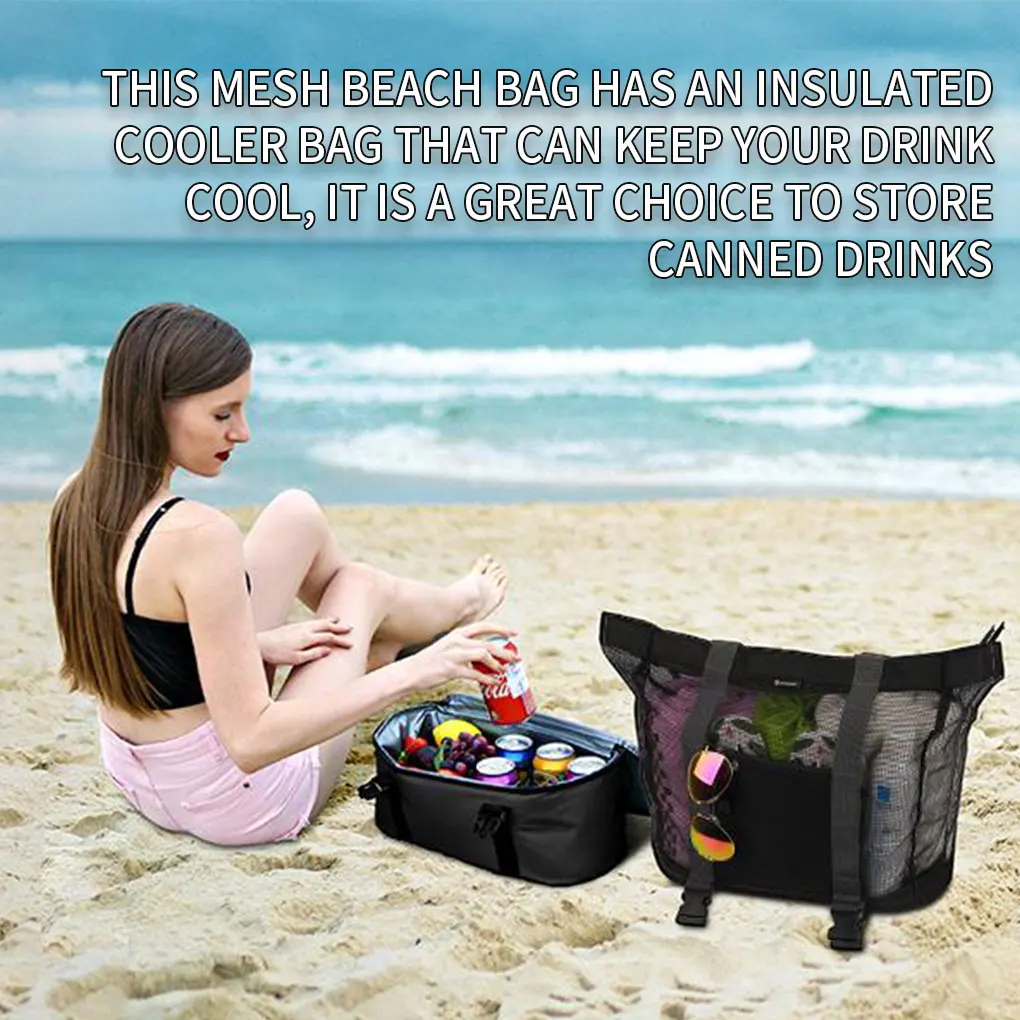 Beach Bag Mesh Tote Handbag with Insulated Cooler Bag Summer Vacation Beach Walking Handbag Black