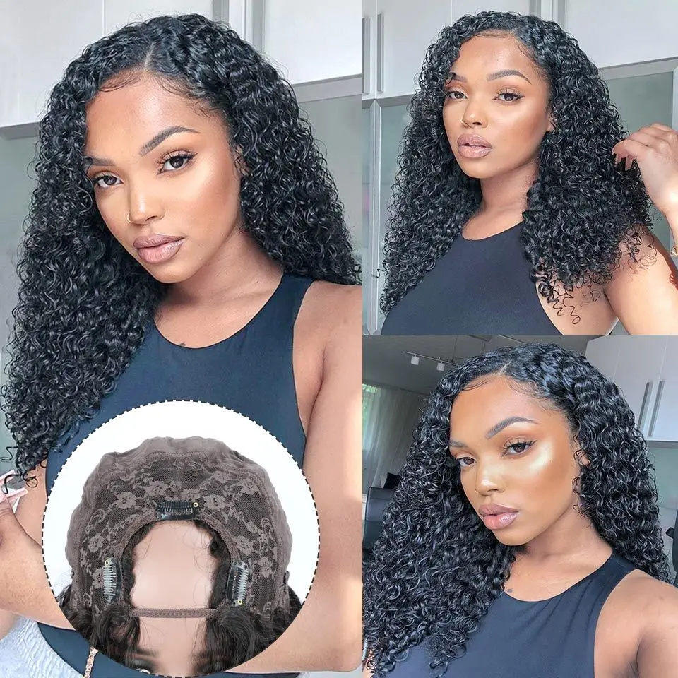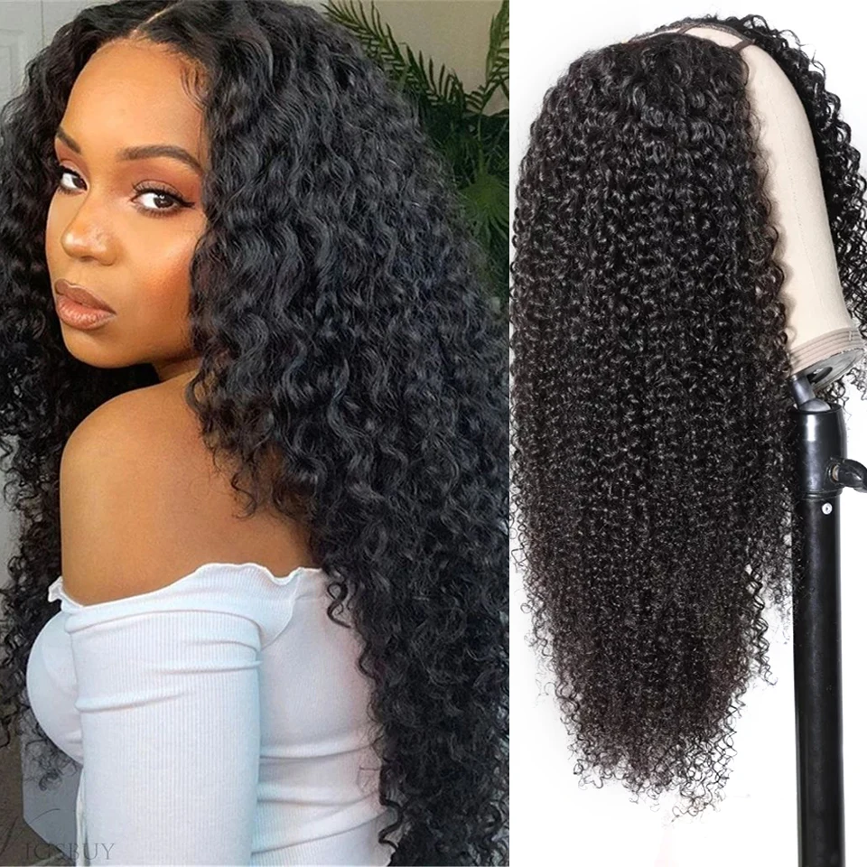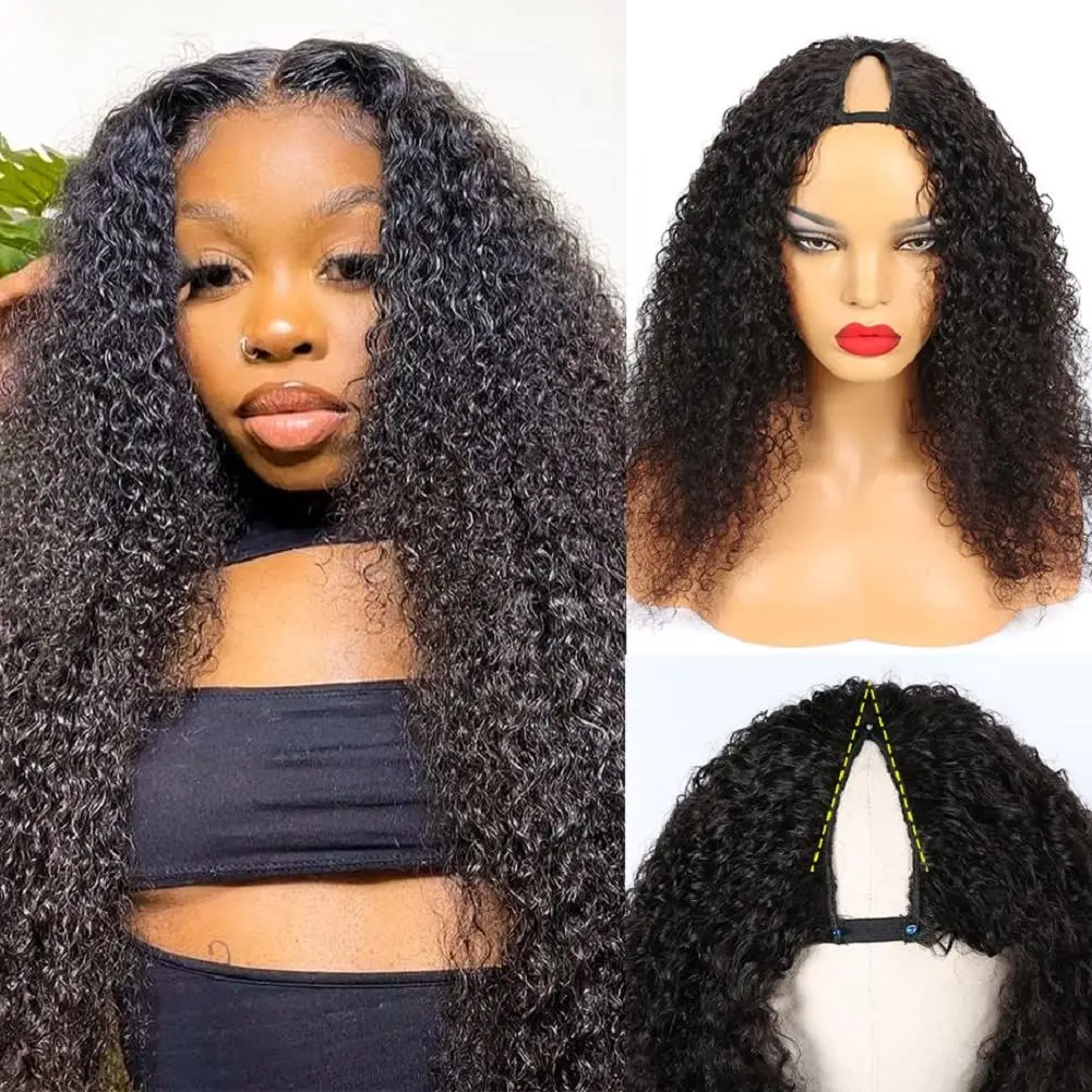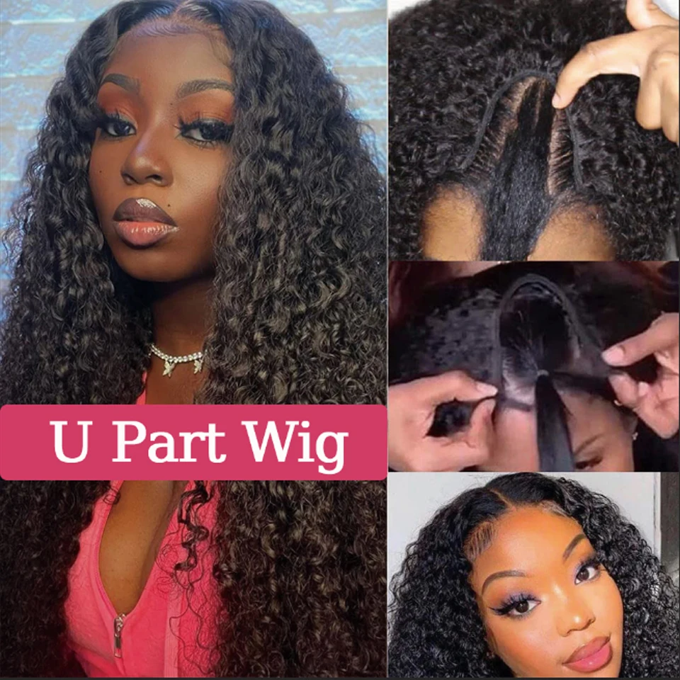 Kinky Curly U Part Human Hair Wig Brazilian Remy Hair U Part Wig Deep Wave None Lace Front Wig for Black Women Natural Color