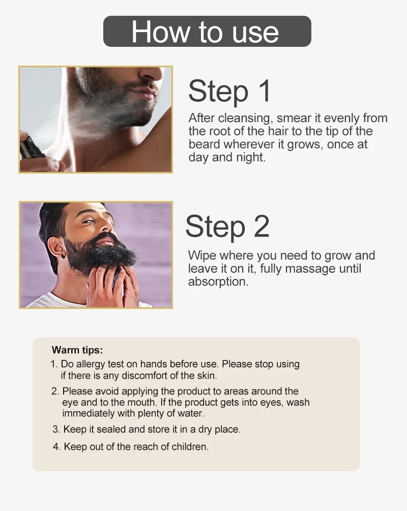 (1)After cleansing, smear it evenly from the root of the hair to the tip of the beard wherever it grows,