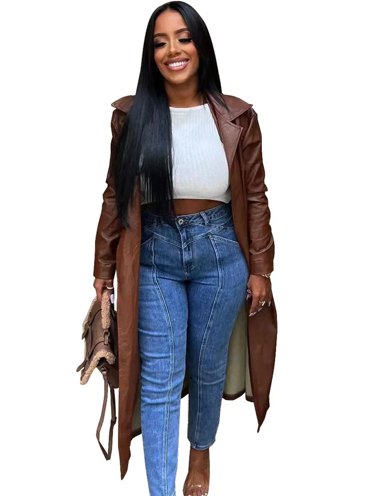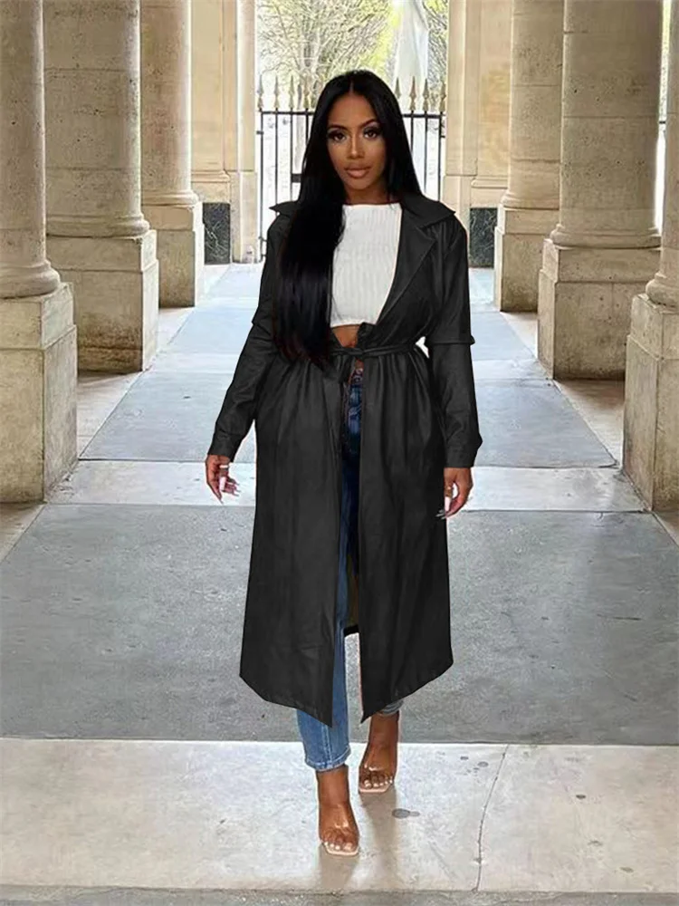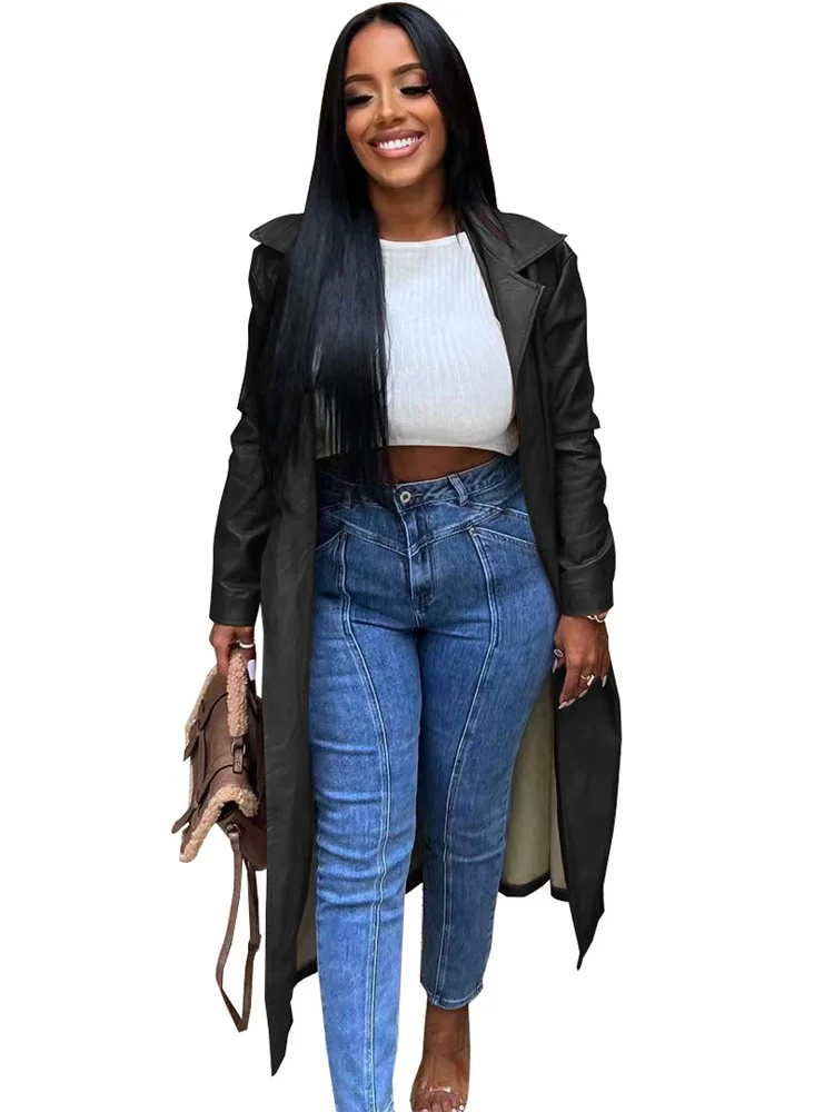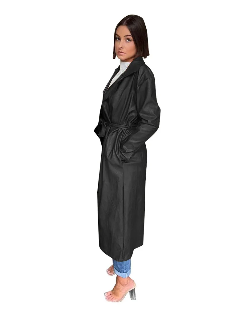 Women Clothing PU Coat Trench Jacket Fashion Street Outwear with Belt Pockets Long Style Tops Wholesale