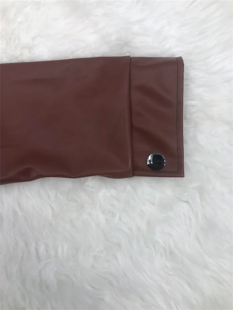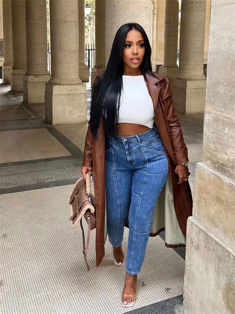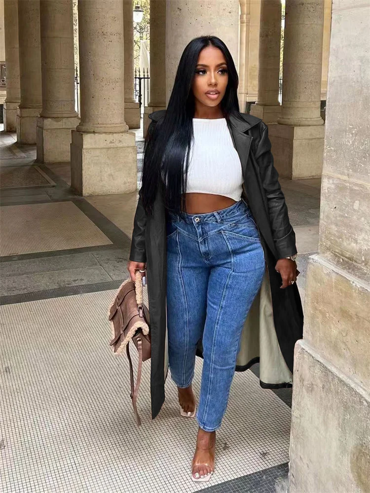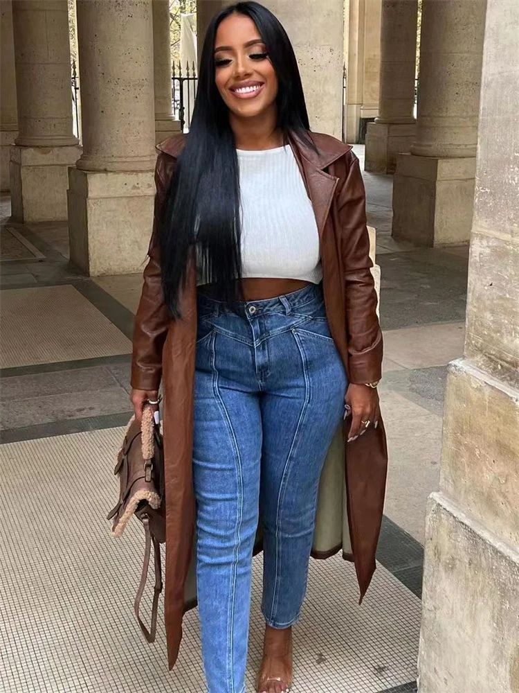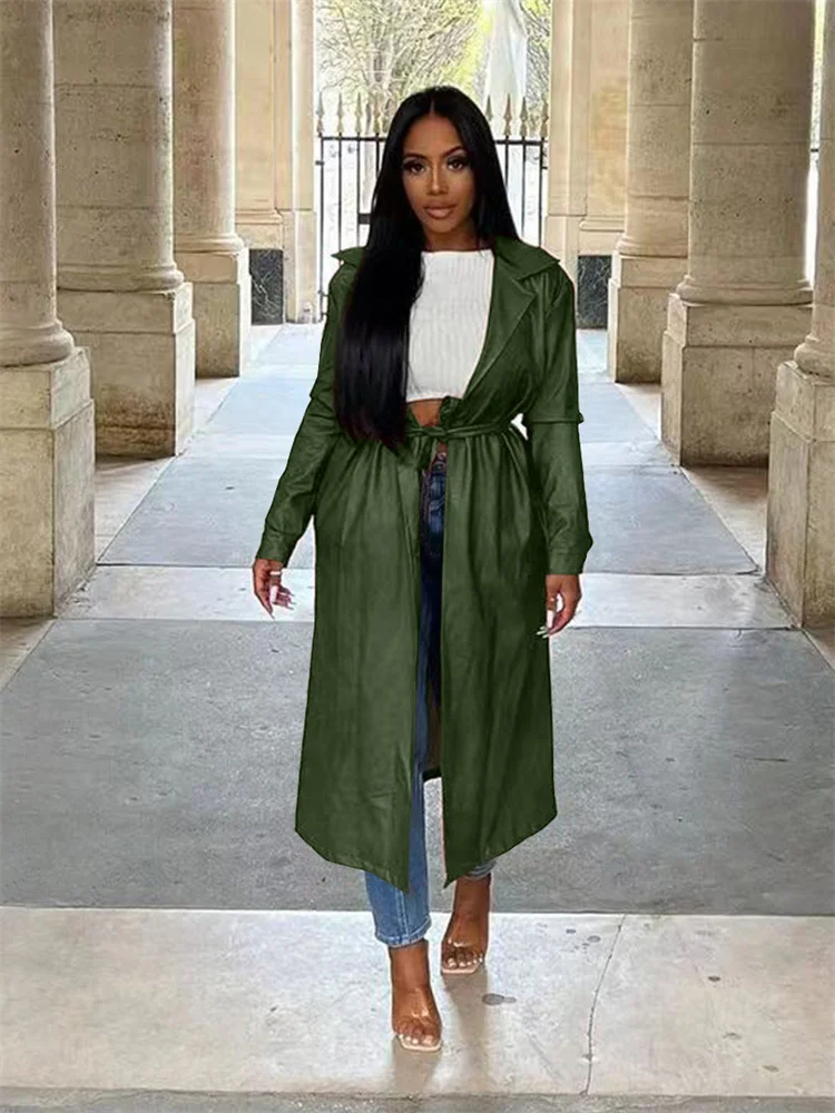 Women Clothing PU Coat Trench Jacket Fashion Street Outwear with Belt Pockets Long Style Tops Wholesale